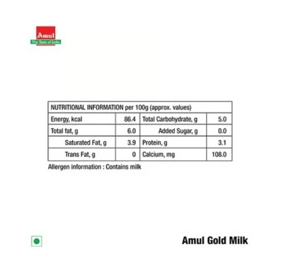 Amul Gold Full Cream Milk (Polypack) Milk is homogenized toned pasteurized milk. Rich and creamy, this milk is an excellent source of vitamin A and vitamin D that enhances growth and development of the body tissues and the brain.