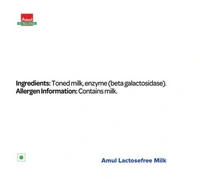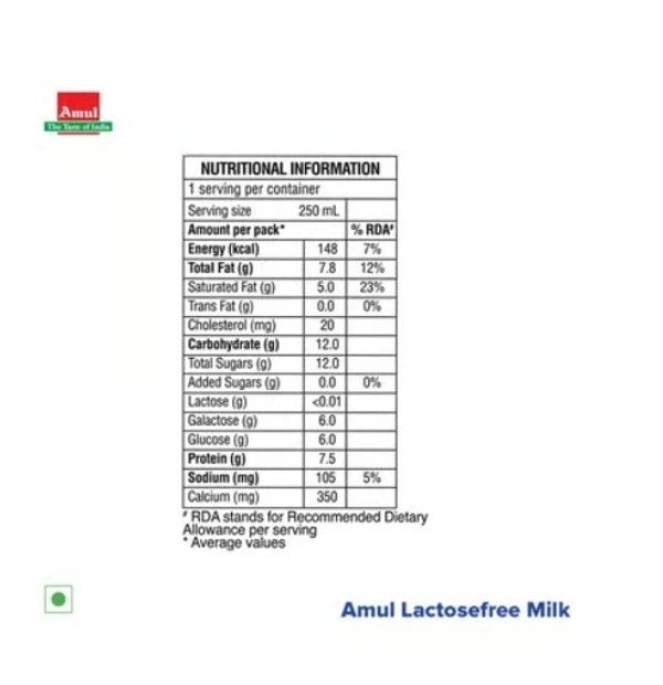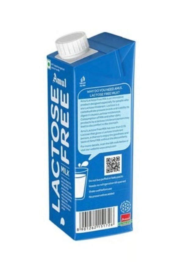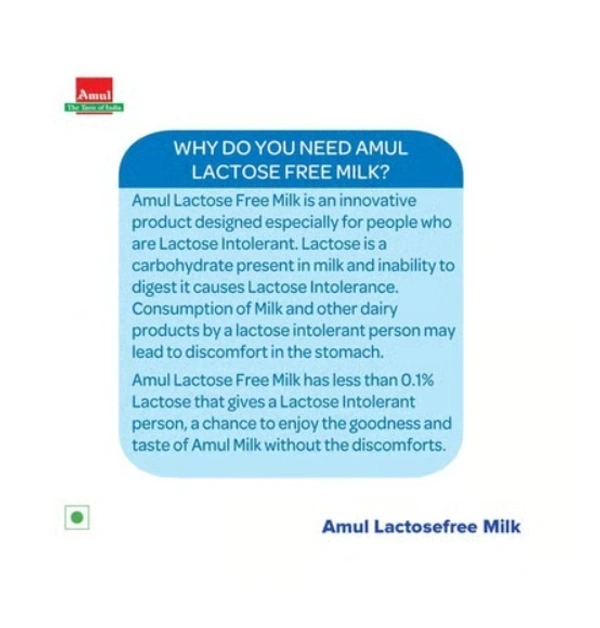 Amul Lactose Free Milk (Tetra Pak) with less than 0.01% lactose content, this milk has all the goodness of protein, calcium vitamins and pre-digested Lactose that helps in easy digestion of milk for lactose intolerant people.
