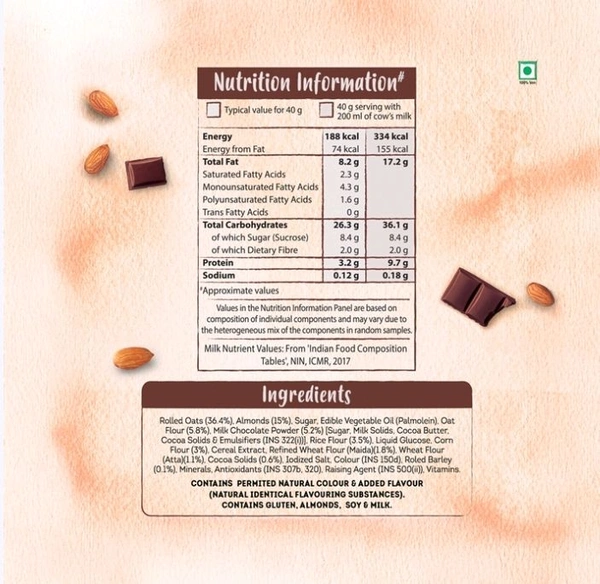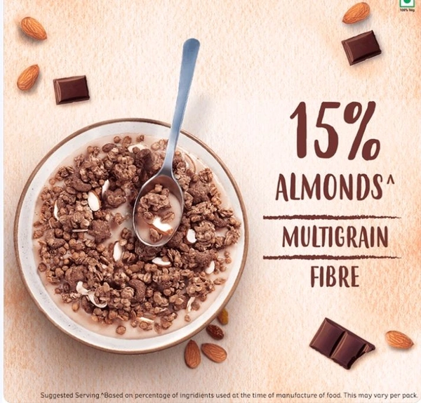 Contains nutritious oats, delicious chocolate, golden wheat, real almonds, crunchy rice, corn crispies etc