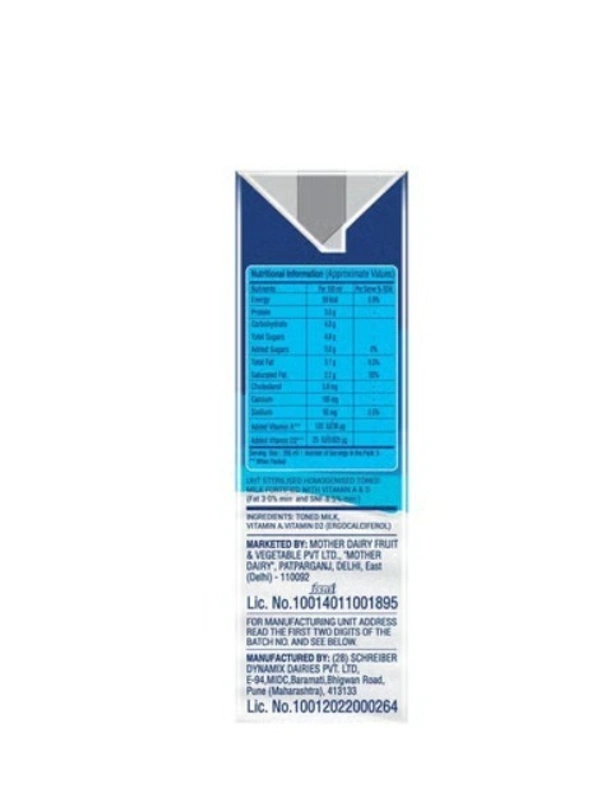 Start the day on a healthy note with Mother Dairy Toned Milk (Tetra Pak). A perfect blend of health and taste, it can be used in the preparation of tea, coffee, sweets, curd, buttermilk, etc.