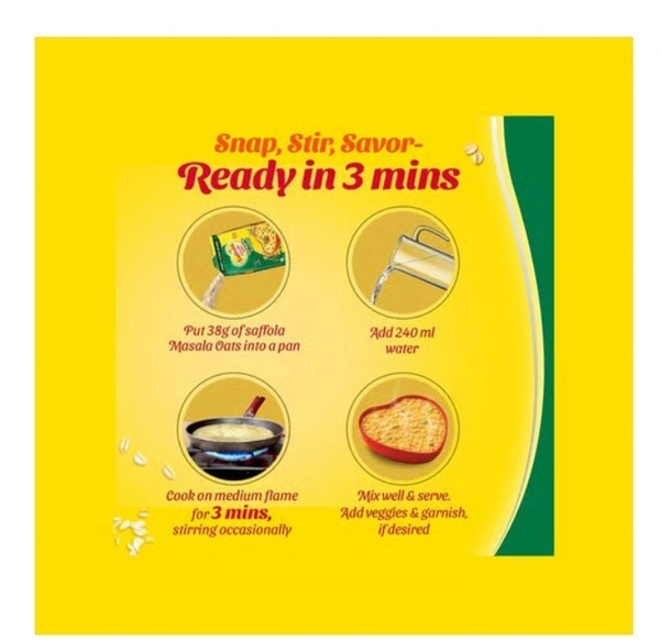 Saffola Masala Oats, a tasty blend of veggies such as carrots, green peas, french beans, topped with yummy masala, and 100% wholegrain Oats, is the perfect snack for all small hunger cravings. Ready in just 3 minutes, all you need is to cook in boiling water! You can enjoy this as a delicious bowl or top it up with peanuts or pomegranate seeds!