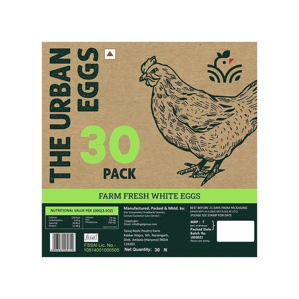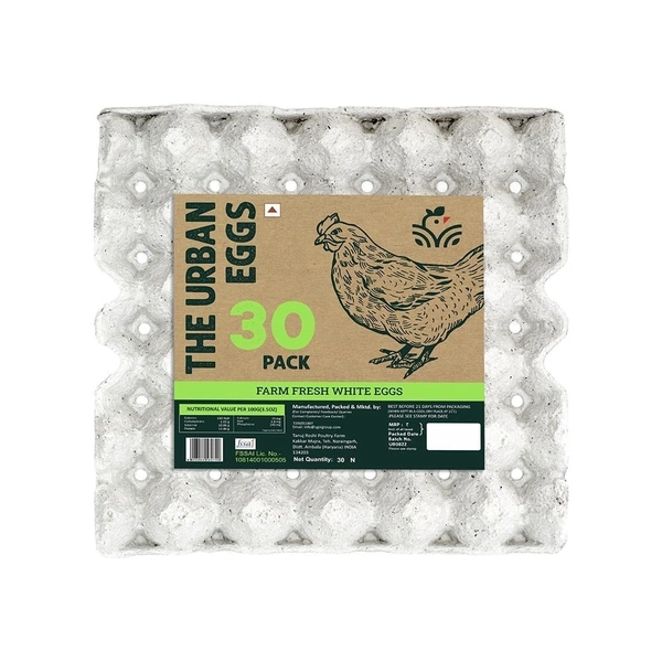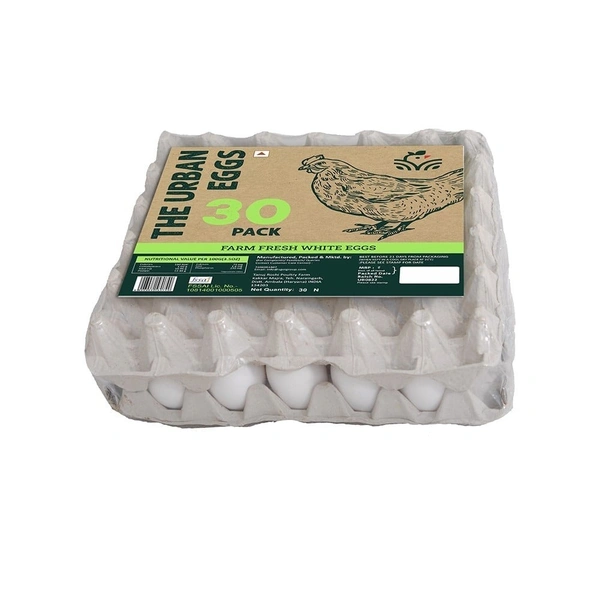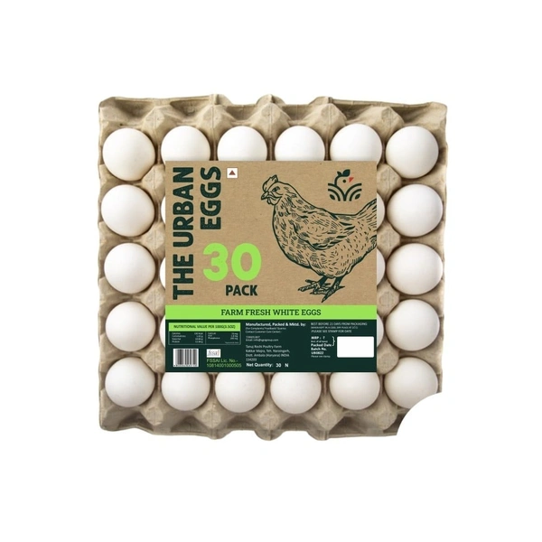 Urban Eggs Farm Fresh White Eggs are a pack of fresh white chicken eggs sold in retail and grocery platforms in India (most commonly in a 30-piece pack). They are marketed as farm-fresh white eggs suitable for everyday cooking and baking